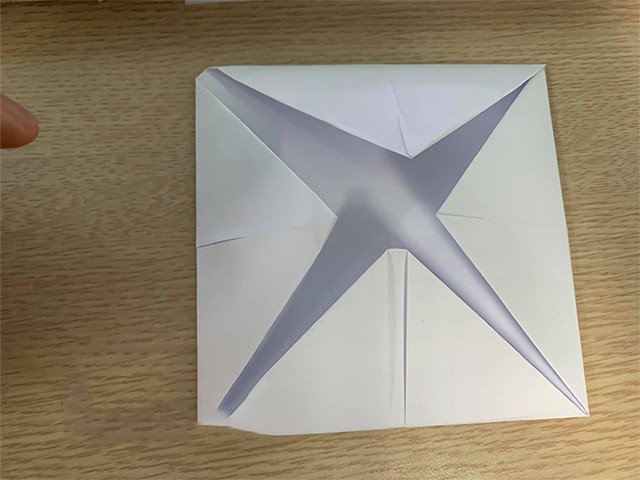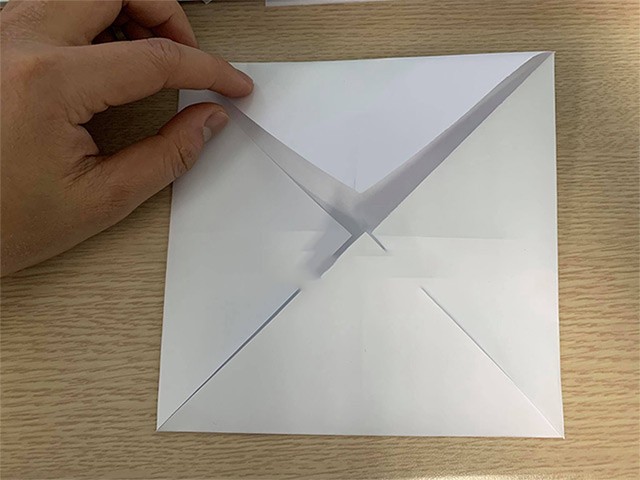 Tiếp theo, gấp bốn góc của tờ giấy vào điểm chính giữa, sao cho các góc này chạm vào nhau tại tâm. Nếu tạo thành một hình vuông nhỏ hơn ở giữa tờ giấy thì chứng tỏ bạn đã thực hiện thành công.