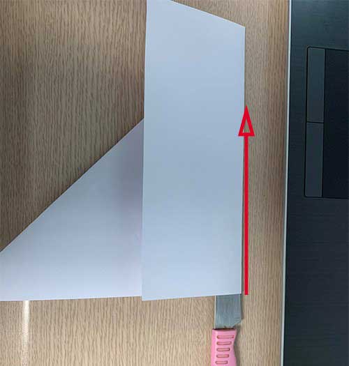 Nhìn vào hình mẫu, hãy cắt bỏ phần giấy thừa để có được hình dạng chính xác như trong hình. Sau khi cắt, bạn sẽ gấp tờ giấy theo hai đường chéo, tạo ra các nếp gấp rõ ràng giúp việc gấp tiếp theo dễ dàng hơn.
