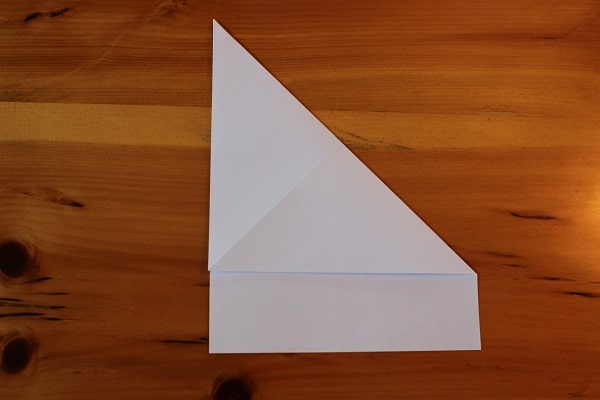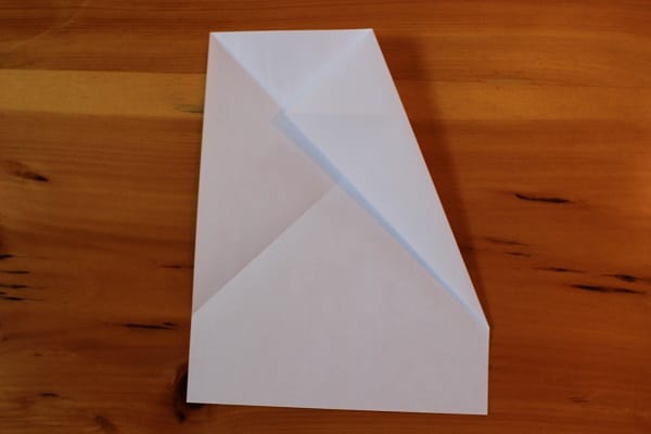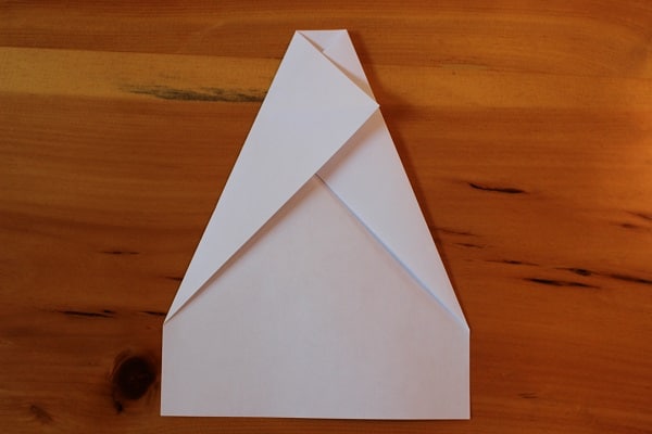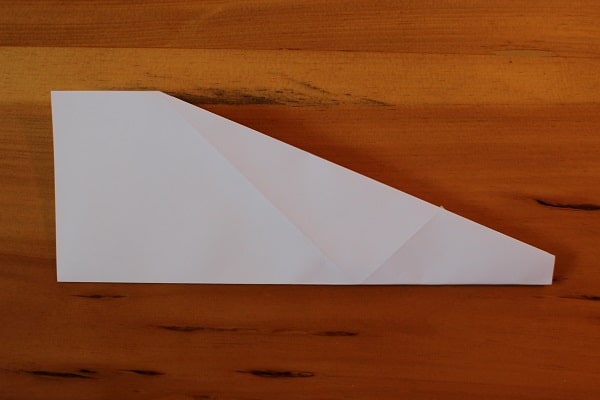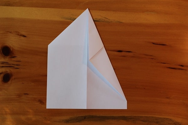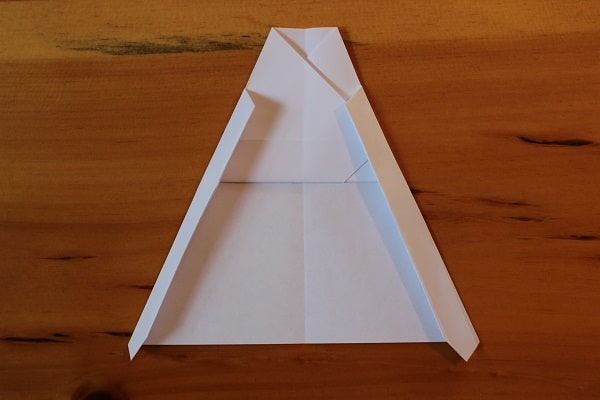 6. Gấp đôi máy bay lại, lần này gấp ra ngoài chứ không gấp vào trong. Bạn cần để phần tam giác nhỏ vẫn hiện rõ ở cạnh dưới.