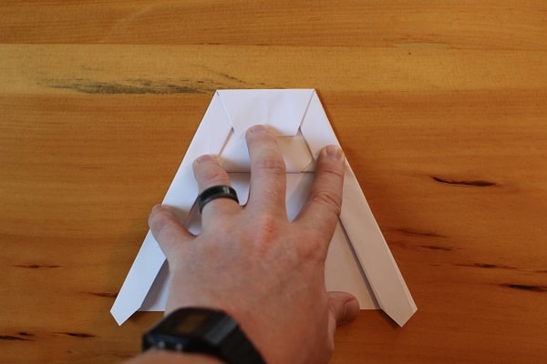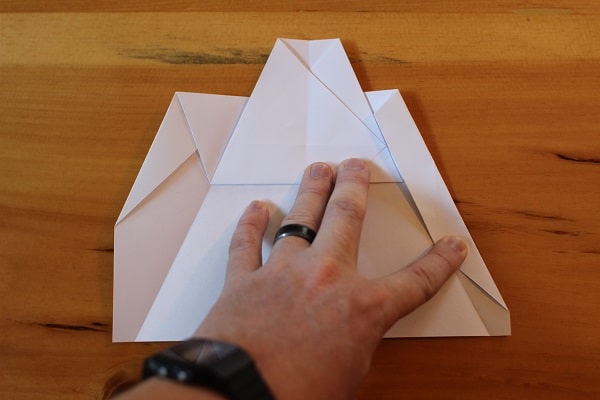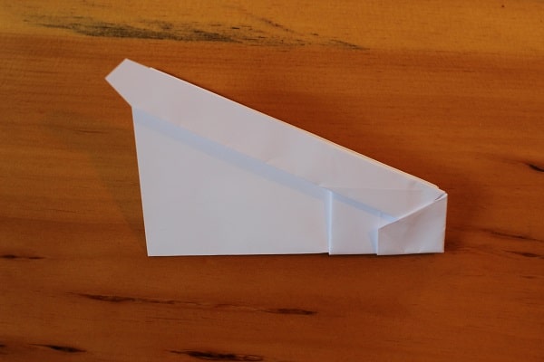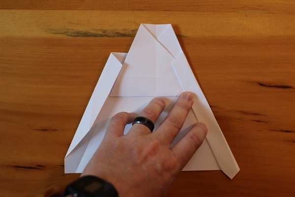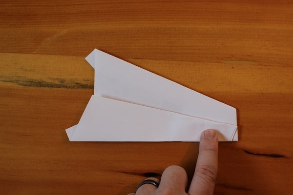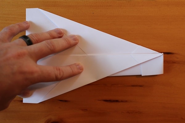 7. Gấp cánh máy bay xuống sao cho mép cánh chạm với cạnh dưới của thân máy bay. Lặp lại với bên còn lại.