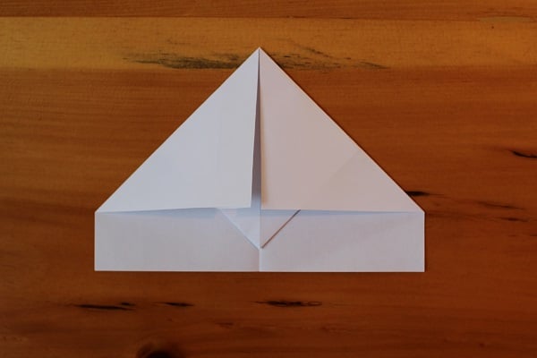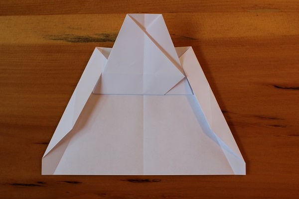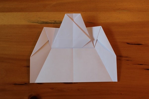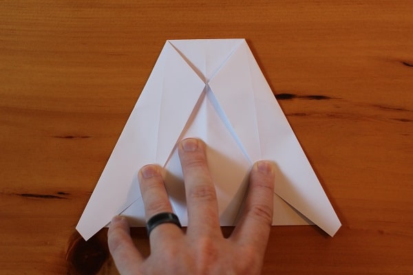 14. Gấp hai cánh xuống sao cho mép của cánh trùng với cạnh dưới của thân máy bay. Bước này sẽ tạo phần mũi ngắn. Đây là bước gấp hơi khó, vì giấy dày, nên hãy kiên nhẫn và làm thật chính xác.