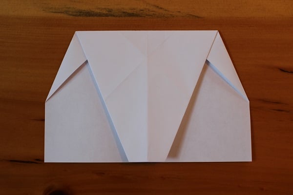Sau khi gấp xong, hai cánh sẽ chạm vào cả phần mép trên và các nếp gấp — đó chính là phần cánh máy bay.
