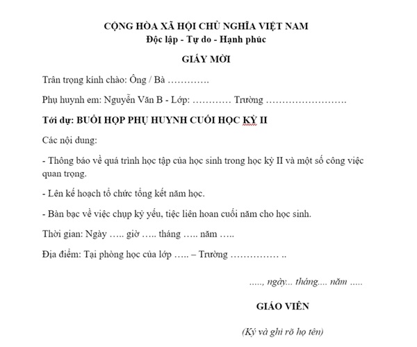 Ngôn từ ghi trong giấy mời phải tự nhiên, dễ hiểu. Giáo viên tránh sử dụng quá nhiều thuật ngữ, ưu tiên lời lẽ mộc mạc, dễ tiếp thu để phụ huynh không gặp khó khăn khi đọc. Ngoài ra, thiệp mời họp file Word phải chứa đủ thông tin quan trọng như: